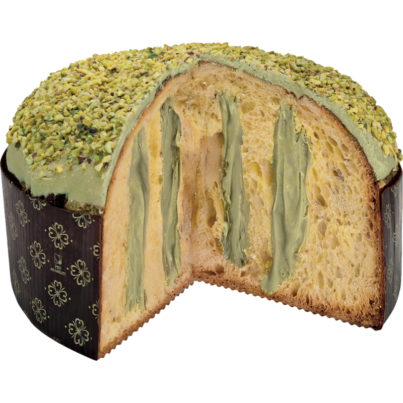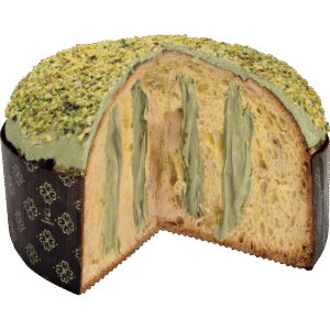 Panettone filled with Sicilian pistachio cream. The intense flavor of pistachio is preserved in a soft dough made with sourdough starter.