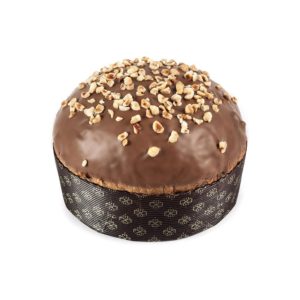 A soft and fragrant leavened Panettone Covered in Milk Chocolate, sprinkled with toasted hazelnuts.